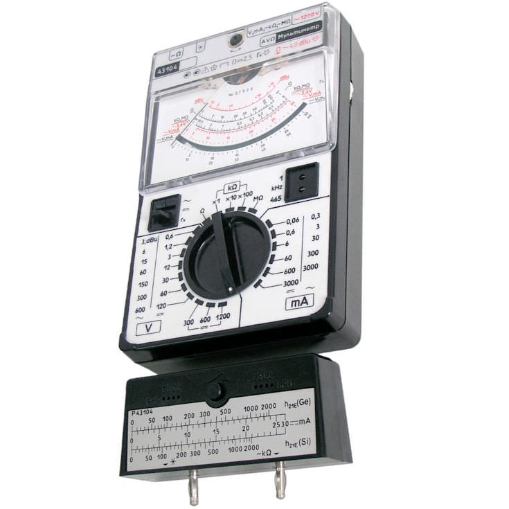 Также, прибор Ц43104 (мультиметр 43104) предназначен для проверки работоспособности трактов усилителей низкой частоты (УНЧ) и промежуточной частоты (УПЧ) радиотехнических устройств с помощью встроенного генератора и для проверки работоспособного состояния биполярных транзисторов с рассеиваемой мощностью до 150 мВт совместно с устройством для подключения транзисторов Р43104, который входит в комплект поставки.
